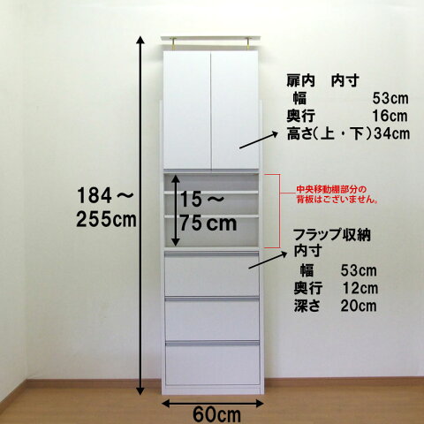 ランドリー 収納 サイズ ・〔本体〕 幅60×奥行20×高さ184〜255cm ・〔扉内寸〕 幅53×奥行16×高さ34cm ・〔オープン部内寸〕 幅56×奥行17×高さ15〜75cm ・〔フラップ収納内寸〕 幅53×奥行12×深さ16(有効深さ20)cm カラー ・ホワイト 材質 〔本体〕 プリント紙化粧繊維板 棚板 上部扉収納 ・固定棚 1枚 ・移動棚 2枚 中部オープン収納 ・移動棚 2枚 棚板耐荷重 10kg フラップ扉耐荷重 3kg 組立難易度 ・ ★
